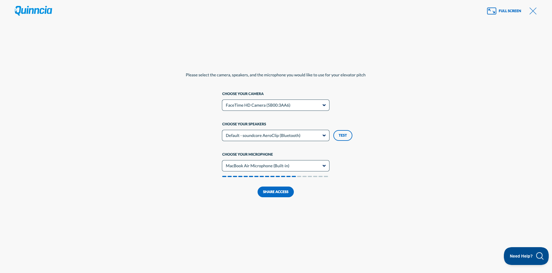 Select the microphone and camera you will be using from the drop-down menu and click Share Access.
