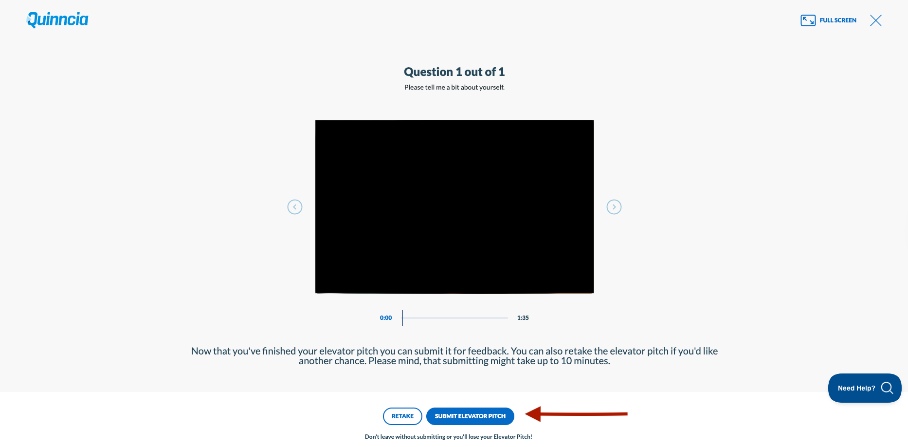 Click the 'Begin Elevator Pitch' button and deliver your pitch. You can toggle the timer by clicking your spacebar on your keyboard. Once you finish, the system will process your video and audio.